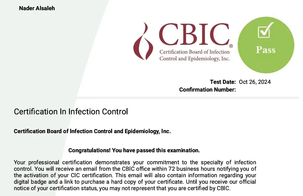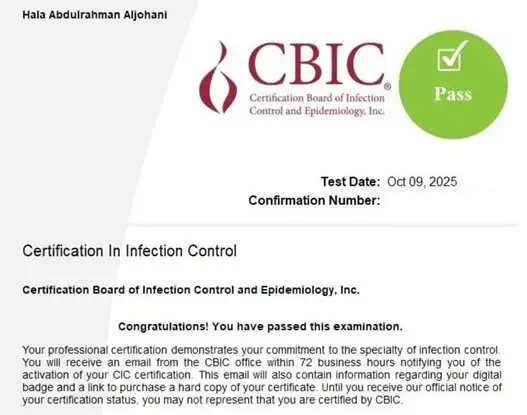 I’m grateful for the knowledge, support, and confidence the course gave me as I worked toward this goal. I am looking forward to applying everything I’ve learned in my ongoing journey in infection prevention and control!"
