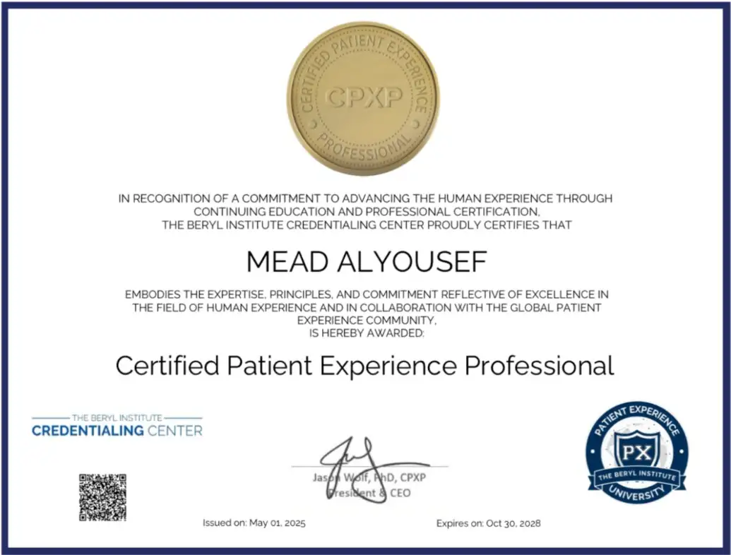 I'm happy to share my positive experience with CPXP Course, delivered by Dr. Mishari Al Sulami through Quality Leaders Academy. His deep expertise, clear explanations, practical illustrations with continuous follow up significantly enriched my understanding of patient experience concepts and best practices.